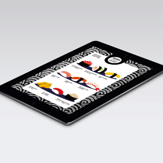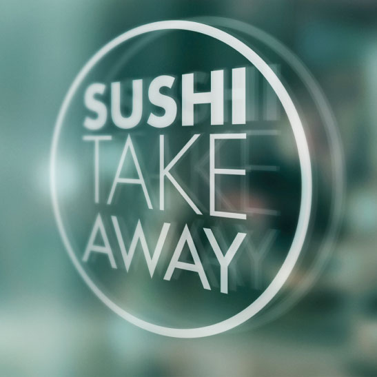 Para "Sushi: Take Away" el briefing constaba de distintas partes: logotipo, tarjetas, vinilo para los ventanales del local, diseño del menú y app para pedidos.La imagen de la marca, se basa al completo en la simulación de las escamas de las carpas, un pez tradicional japonés muy respetado por los nipones, contrastado con blanco, negro y gris se realza una elegancia en la marca; añadir que se usa la forma redonda central como mimo de la bandera japonesa del sol naciente. La tipografia es sans serif, jugando desde la versión light, bold y regular para dar relevancia por ejemplo a la palabra "Sushi".